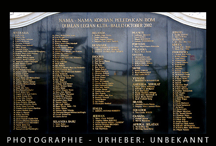 Am 12.10.2002 explodierten im Ferienort Kuta mehrere Bomben in bzw. vor den Diskotheken "Paddy`s" und "Sari Club". 202 Menschen kommen uns Leben und mehr als 300 werden verletzt.