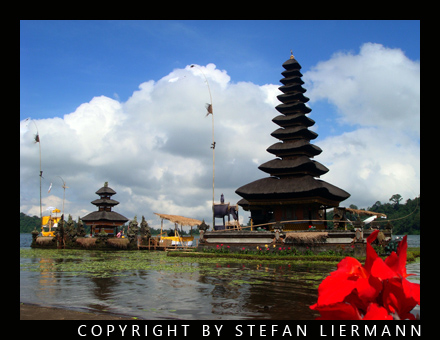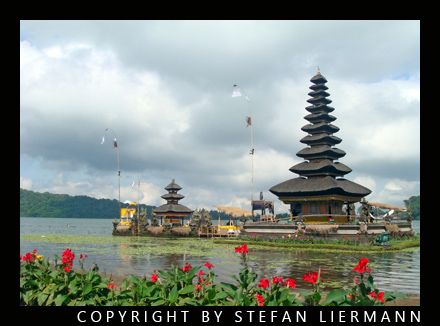 Der malerische Tempel "Ulun Danu", erbaut 1633, liegt an der Südwestseite des Bratan-Kratersees, der sich in dem Kegel des erloschenen Vulkans Gunung Catur befindet. Das Wasser des Sees ist sehr trübe und vor allem sehr tief, was sicher aus der früheren, vulkanischen Natur hergeleitet werden kann. Das Besondere dieses Tempelkomplexes ist, dass sich dem Betrachter durch die exponierte Lage auf einer kleinen Anhöhe der Eindruck vermittelt, dass die gesamte Anlage auf dem Wasser treiben, ja geradezu schweben würde. Dies wird durch die Seerosen, welche sich in unmittelbarer Nähe befinden, noch verstärkt, wie man recht gut im oben stehenden Bild erkennen kann.